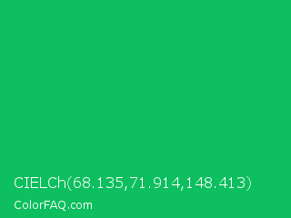 CIELCh 68.135,71.914,148.413 Color is a normal green color and the nearest color is GO Green #00ab66. Hex code #0dbf5e and RGB value is rgb(13,191,94). In RGB color space, this color is composed of 5% red, 75% green, 37% blue, In CMYK color space, this color is composed of 93% cyan, 0% magenta, 51% yellow , 25% black , In HSL color space, this color has a hue angle of 147° , 87% saturation and 40% lightness.