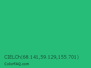 CIELCh 68.141,59.129,155.701 Color is a normal green color and the nearest color is Green Crayola #1cac78. Hex code #26bd78 and RGB value is rgb(38,189,120). In RGB color space, this color is composed of 15% red, 74% green, 47% blue, In CMYK color space, this color is composed of 80% cyan, 0% magenta, 37% yellow , 26% black , In HSL color space, this color has a hue angle of 153° , 67% saturation and 45% lightness.
