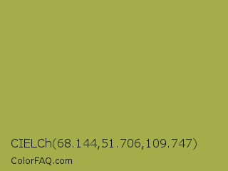 CIELCh 68.144,51.706,109.747 Color is a normal yellow color and the nearest color is Brass #b5a642. Hex code #a3ad4a and RGB value is rgb(163,173,74). In RGB color space, this color is composed of 64% red, 68% green, 29% blue, In CMYK color space, this color is composed of 6% cyan, 0% magenta, 57% yellow , 32% black , In HSL color space, this color has a hue angle of 66° , 40% saturation and 48% lightness.