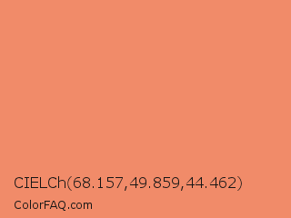 CIELCh 68.157,49.859,44.462 Color is a light color and the nearest color is Salmon #ff8c69. Hex code #f18b69 and RGB value is rgb(241,139,105). In RGB color space, this color is composed of 95% red, 55% green, 41% blue, In CMYK color space, this color is composed of 0% cyan, 42% magenta, 56% yellow , 5% black , In HSL color space, this color has a hue angle of 15° , 83% saturation and 68% lightness.