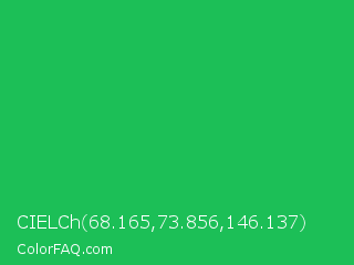 CIELCh 68.165,73.856,146.137 Color is a normal green color and the nearest color is Malachite #0bda51. Hex code #1cbf57 and RGB value is rgb(28,191,87). In RGB color space, this color is composed of 11% red, 75% green, 34% blue, In CMYK color space, this color is composed of 85% cyan, 0% magenta, 54% yellow , 25% black , In HSL color space, this color has a hue angle of 142° , 74% saturation and 43% lightness.