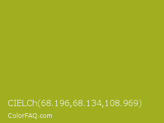 CIELCh 68.196,68.134,108.969 Color is a normal yellow color and the nearest color is Citron #9fa91f. Hex code #a0af20 and RGB value is rgb(160,175,32). In RGB color space, this color is composed of 63% red, 69% green, 13% blue, In CMYK color space, this color is composed of 9% cyan, 0% magenta, 82% yellow , 31% black , In HSL color space, this color has a hue angle of 66° , 69% saturation and 41% lightness.