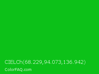 CIELCh 68.229,94.073,136.942 Color is a normal green color and the nearest color is Vivid Malachite #00cc33. Hex code #0cc118 and RGB value is rgb(12,193,24). In RGB color space, this color is composed of 5% red, 76% green, 9% blue, In CMYK color space, this color is composed of 94% cyan, 0% magenta, 88% yellow , 24% black , In HSL color space, this color has a hue angle of 124° , 88% saturation and 40% lightness.