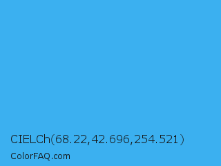 CIELCh 68.22,42.696,254.521 Color is a normal blue color and the nearest color is Picton Blue #45b1e8. Hex code #3bb0f0 and RGB value is rgb(59,176,240). In RGB color space, this color is composed of 23% red, 69% green, 94% blue, In CMYK color space, this color is composed of 75% cyan, 27% magenta, 0% yellow , 6% black , In HSL color space, this color has a hue angle of 201° , 86% saturation and 59% lightness.