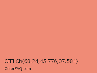 CIELCh 68.24,45.776,37.584 Color is a light red color and the nearest color is Apricot #eb9373. Hex code #f08b76 and RGB value is rgb(240,139,118). In RGB color space, this color is composed of 94% red, 55% green, 46% blue, In CMYK color space, this color is composed of 0% cyan, 42% magenta, 51% yellow , 6% black , In HSL color space, this color has a hue angle of 10° , 80% saturation and 70% lightness.