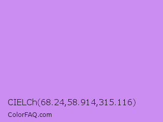 CIELCh 68.24,58.914,315.116 Color is a light purple color and the nearest color is Bright Lilac #d891ef. Hex code #cc8df2 and RGB value is rgb(204,141,242). In RGB color space, this color is composed of 80% red, 55% green, 95% blue, In CMYK color space, this color is composed of 16% cyan, 42% magenta, 0% yellow , 5% black , In HSL color space, this color has a hue angle of 277° , 80% saturation and 75% lightness.