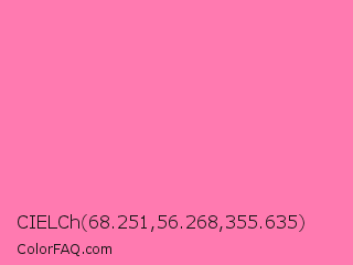 CIELCh 68.251,56.268,355.635 Color is a light rose color and the nearest color is Tickle Me Pink Crayola #fc80a5. Hex code #ff7ab0 and RGB value is rgb(255,122,176). In RGB color space, this color is composed of 100% red, 48% green, 69% blue, In CMYK color space, this color is composed of 0% cyan, 52% magenta, 31% yellow , 0% black , In HSL color space, this color has a hue angle of 336° , 100% saturation and 74% lightness.