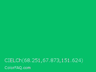 CIELCh 68.251,67.873,151.624 Color is a normal green color and the nearest color is GO Green #00ab66. Hex code #05bf69 and RGB value is rgb(5,191,105). In RGB color space, this color is composed of 2% red, 75% green, 41% blue, In CMYK color space, this color is composed of 97% cyan, 0% magenta, 45% yellow , 25% black , In HSL color space, this color has a hue angle of 152° , 95% saturation and 38% lightness.