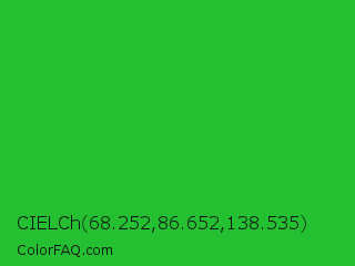 CIELCh 68.252,86.652,138.535 Color is a normal green color and the nearest color is Lime Green #32cd32. Hex code #25c031 and RGB value is rgb(37,192,49). In RGB color space, this color is composed of 15% red, 75% green, 19% blue, In CMYK color space, this color is composed of 81% cyan, 0% magenta, 74% yellow , 25% black , In HSL color space, this color has a hue angle of 125° , 68% saturation and 45% lightness.