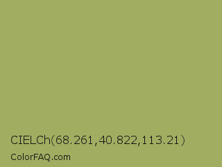 CIELCh 68.261,40.822,113.21 Color is a normal yellow color and the nearest color is Green Smoke #a4af6e. Hex code #a1ad61 and RGB value is rgb(161,173,97). In RGB color space, this color is composed of 63% red, 68% green, 38% blue, In CMYK color space, this color is composed of 7% cyan, 0% magenta, 44% yellow , 32% black , In HSL color space, this color has a hue angle of 69° , 32% saturation and 53% lightness.