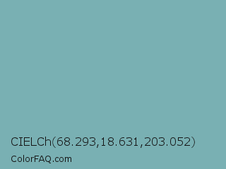 CIELCh 68.293,18.631,203.052 Color is a normal cyan color and the nearest color is Gulf Stream #80b3ae. Hex code #79b0b3 and RGB value is rgb(121,176,179). In RGB color space, this color is composed of 47% red, 69% green, 70% blue, In CMYK color space, this color is composed of 32% cyan, 2% magenta, 0% yellow , 30% black , In HSL color space, this color has a hue angle of 183° , 28% saturation and 59% lightness.
