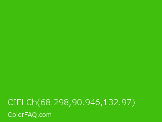 CIELCh 68.298,90.946,132.97 Color is a normal green color and the nearest color is Kelly Green #4cbb17. Hex code #40bf0c and RGB value is rgb(64,191,12). In RGB color space, this color is composed of 25% red, 75% green, 5% blue, In CMYK color space, this color is composed of 66% cyan, 0% magenta, 94% yellow , 25% black , In HSL color space, this color has a hue angle of 103° , 88% saturation and 40% lightness.