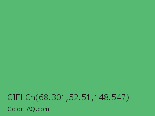 CIELCh 68.301,52.51,148.547 Color is a normal green color and the nearest color is Fern #63b76c. Hex code #57ba73 and RGB value is rgb(87,186,115). In RGB color space, this color is composed of 34% red, 73% green, 45% blue, In CMYK color space, this color is composed of 53% cyan, 0% magenta, 38% yellow , 27% black , In HSL color space, this color has a hue angle of 137° , 42% saturation and 54% lightness.