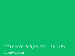 CIELCh 68.305,66.932,152.115 Color is a normal green color and the nearest color is GO Green #00ab66. Hex code #0abf6b and RGB value is rgb(10,191,107). In RGB color space, this color is composed of 4% red, 75% green, 42% blue, In CMYK color space, this color is composed of 95% cyan, 0% magenta, 44% yellow , 25% black , In HSL color space, this color has a hue angle of 152° , 90% saturation and 39% lightness.