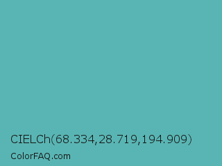 CIELCh 68.334,28.719,194.909 Color is a normal cyan color and the nearest color is Tradewind #5fb3ac. Hex code #59b5b3 and RGB value is rgb(89,181,179). In RGB color space, this color is composed of 35% red, 71% green, 70% blue, In CMYK color space, this color is composed of 51% cyan, 0% magenta, 1% yellow , 29% black , In HSL color space, this color has a hue angle of 179° , 38% saturation and 53% lightness.