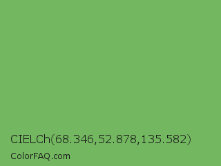 CIELCh 68.346,52.878,135.582 Color is a normal green color and the nearest color is Bud Green #7bb661. Hex code #74b761 and RGB value is rgb(116,183,97). In RGB color space, this color is composed of 45% red, 72% green, 38% blue, In CMYK color space, this color is composed of 37% cyan, 0% magenta, 47% yellow , 28% black , In HSL color space, this color has a hue angle of 107° , 37% saturation and 55% lightness.