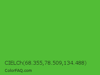 CIELCh 68.355,78.509,134.488 Color is a normal green color and the nearest color is Apple #4fa83d. Hex code #52bd36 and RGB value is rgb(82,189,54). In RGB color space, this color is composed of 32% red, 74% green, 21% blue, In CMYK color space, this color is composed of 57% cyan, 0% magenta, 71% yellow , 26% black , In HSL color space, this color has a hue angle of 108° , 56% saturation and 48% lightness.