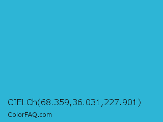 CIELCh 68.359,36.031,227.901 Color is a normal cyan color and the nearest color is Scooter #2ebfd4. Hex code #2db5d6 and RGB value is rgb(45,181,214). In RGB color space, this color is composed of 18% red, 71% green, 84% blue, In CMYK color space, this color is composed of 79% cyan, 15% magenta, 0% yellow , 16% black , In HSL color space, this color has a hue angle of 192° , 67% saturation and 51% lightness.