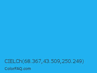 CIELCh 68.367,43.509,250.249 Color is a normal blue color and the nearest color is Button Blue #24a0ed. Hex code #22b2f0 and RGB value is rgb(34,178,240). In RGB color space, this color is composed of 13% red, 70% green, 94% blue, In CMYK color space, this color is composed of 86% cyan, 26% magenta, 0% yellow , 6% black , In HSL color space, this color has a hue angle of 198° , 87% saturation and 54% lightness.
