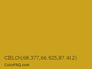 CIELCh 68.377,66.925,87.412 Color is a normal yellow color and the nearest color is Lemon Curry #cca01d. Hex code #caa21d and RGB value is rgb(202,162,29). In RGB color space, this color is composed of 79% red, 64% green, 11% blue, In CMYK color space, this color is composed of 0% cyan, 20% magenta, 86% yellow , 21% black , In HSL color space, this color has a hue angle of 46° , 75% saturation and 45% lightness.
