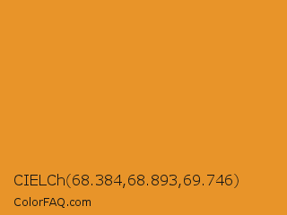 CIELCh 68.384,68.893,69.746 Color is a normal orange color and the nearest color is Fire Bush #e89928. Hex code #e89429 and RGB value is rgb(232,148,41). In RGB color space, this color is composed of 91% red, 58% green, 16% blue, In CMYK color space, this color is composed of 0% cyan, 36% magenta, 82% yellow , 9% black , In HSL color space, this color has a hue angle of 34° , 81% saturation and 54% lightness.