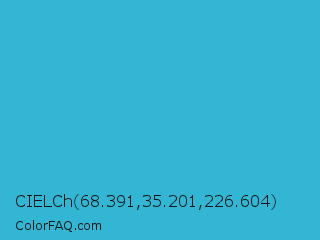 CIELCh 68.391,35.201,226.604 Color is a normal cyan color and the nearest color is Scooter #2ebfd4. Hex code #33b5d4 and RGB value is rgb(51,181,212). In RGB color space, this color is composed of 20% red, 71% green, 83% blue, In CMYK color space, this color is composed of 76% cyan, 15% magenta, 0% yellow , 17% black , In HSL color space, this color has a hue angle of 192° , 65% saturation and 52% lightness.
