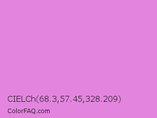 CIELCh 68.3,57.45,328.209 Color is a light magenta color and the nearest color is Lavender Magenta #ee82ee. Hex code #e385de and RGB value is rgb(227,133,222). In RGB color space, this color is composed of 89% red, 52% green, 87% blue, In CMYK color space, this color is composed of 0% cyan, 41% magenta, 2% yellow , 11% black , In HSL color space, this color has a hue angle of 303° , 63% saturation and 71% lightness.