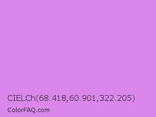 CIELCh 68.418,60.901,322.205 Color is a light purple color and the nearest color is Bright Lilac #d891ef. Hex code #dc87eb and RGB value is rgb(220,135,235). In RGB color space, this color is composed of 86% red, 53% green, 92% blue, In CMYK color space, this color is composed of 6% cyan, 43% magenta, 0% yellow , 8% black , In HSL color space, this color has a hue angle of 291° , 71% saturation and 73% lightness.