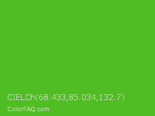 CIELCh 68.433,85.034,132.7 Color is a normal green color and the nearest color is Kelly Green #4cbb17. Hex code #4ebe22 and RGB value is rgb(78,190,34). In RGB color space, this color is composed of 31% red, 75% green, 13% blue, In CMYK color space, this color is composed of 59% cyan, 0% magenta, 82% yellow , 25% black , In HSL color space, this color has a hue angle of 103° , 70% saturation and 44% lightness.
