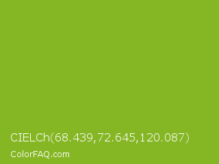 CIELCh 68.439,72.645,120.087 Color is a normal green color and the nearest color is Lima #76bd17. Hex code #85b624 and RGB value is rgb(133,182,36). In RGB color space, this color is composed of 52% red, 71% green, 14% blue, In CMYK color space, this color is composed of 27% cyan, 0% magenta, 80% yellow , 29% black , In HSL color space, this color has a hue angle of 80° , 67% saturation and 43% lightness.
