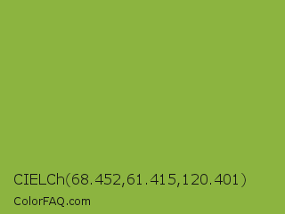 CIELCh 68.452,61.415,120.401 Color is a normal green color and the nearest color is Sushi #87ab39. Hex code #8cb440 and RGB value is rgb(140,180,64). In RGB color space, this color is composed of 55% red, 71% green, 25% blue, In CMYK color space, this color is composed of 22% cyan, 0% magenta, 64% yellow , 29% black , In HSL color space, this color has a hue angle of 81° , 48% saturation and 48% lightness.