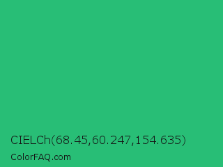 CIELCh 68.45,60.247,154.635 Color is a normal green color and the nearest color is Green Crayola #1cac78. Hex code #28be76 and RGB value is rgb(40,190,118). In RGB color space, this color is composed of 16% red, 75% green, 46% blue, In CMYK color space, this color is composed of 79% cyan, 0% magenta, 38% yellow , 25% black , In HSL color space, this color has a hue angle of 151° , 65% saturation and 45% lightness.