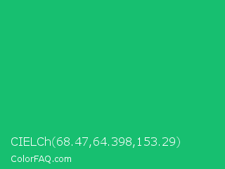 CIELCh 68.47,64.398,153.29 Color is a normal green color and the nearest color is Green Crayola #1cac78. Hex code #17bf70 and RGB value is rgb(23,191,112). In RGB color space, this color is composed of 9% red, 75% green, 44% blue, In CMYK color space, this color is composed of 88% cyan, 0% magenta, 41% yellow , 25% black , In HSL color space, this color has a hue angle of 152° , 79% saturation and 42% lightness.