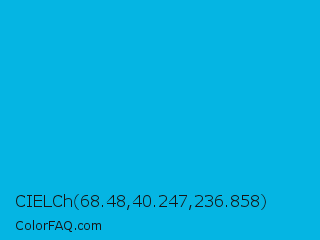 CIELCh 68.48,40.247,236.858 Color is a normal cyan color and the nearest color is Cyan Process #00b7eb. Hex code #05b5e3 and RGB value is rgb(5,181,227). In RGB color space, this color is composed of 2% red, 71% green, 89% blue, In CMYK color space, this color is composed of 98% cyan, 20% magenta, 0% yellow , 11% black , In HSL color space, this color has a hue angle of 192° , 96% saturation and 45% lightness.