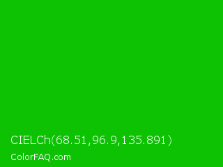 CIELCh 68.51,96.9,135.891 Color is a normal green color and the nearest color is Vivid Malachite #00cc33. Hex code #0cc203 and RGB value is rgb(12,194,3). In RGB color space, this color is composed of 5% red, 76% green, 1% blue, In CMYK color space, this color is composed of 94% cyan, 0% magenta, 98% yellow , 24% black , In HSL color space, this color has a hue angle of 117° , 97% saturation and 39% lightness.