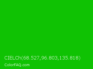CIELCh 68.527,96.803,135.818 Color is a normal green color and the nearest color is Vivid Malachite #00cc33. Hex code #0fc203 and RGB value is rgb(15,194,3). In RGB color space, this color is composed of 6% red, 76% green, 1% blue, In CMYK color space, this color is composed of 92% cyan, 0% magenta, 98% yellow , 24% black , In HSL color space, this color has a hue angle of 116° , 97% saturation and 39% lightness.