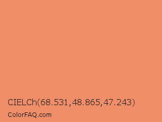 CIELCh 68.531,48.865,47.243 Color is a light orange color and the nearest color is Apricot #eb9373. Hex code #ef8e68 and RGB value is rgb(239,142,104). In RGB color space, this color is composed of 94% red, 56% green, 41% blue, In CMYK color space, this color is composed of 0% cyan, 41% magenta, 56% yellow , 6% black , In HSL color space, this color has a hue angle of 17° , 81% saturation and 67% lightness.