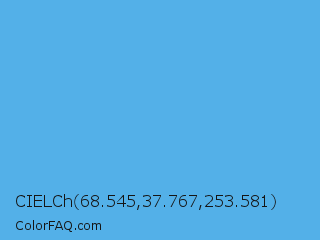 CIELCh 68.545,37.767,253.581 Color is a light blue color and the nearest color is Blue Jeans #5dadec. Hex code #53b0e8 and RGB value is rgb(83,176,232). In RGB color space, this color is composed of 33% red, 69% green, 91% blue, In CMYK color space, this color is composed of 64% cyan, 24% magenta, 0% yellow , 9% black , In HSL color space, this color has a hue angle of 203° , 76% saturation and 62% lightness.