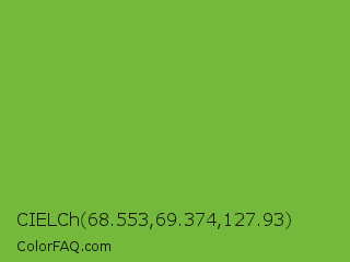CIELCh 68.553,69.374,127.93 Color is a normal green color and the nearest color is Green RYB #66b032. Hex code #74b93b and RGB value is rgb(116,185,59). In RGB color space, this color is composed of 45% red, 73% green, 23% blue, In CMYK color space, this color is composed of 37% cyan, 0% magenta, 68% yellow , 27% black , In HSL color space, this color has a hue angle of 93° , 52% saturation and 48% lightness.