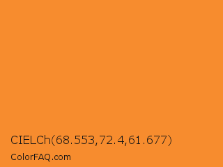 CIELCh 68.553,72.4,61.677 Color is a normal orange color and the nearest color is Cadmium Orange #ed872d. Hex code #f78c2e and RGB value is rgb(247,140,46). In RGB color space, this color is composed of 97% red, 55% green, 18% blue, In CMYK color space, this color is composed of 0% cyan, 43% magenta, 81% yellow , 3% black , In HSL color space, this color has a hue angle of 28° , 93% saturation and 57% lightness.