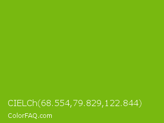 CIELCh 68.554,79.829,122.844 Color is a normal green color and the nearest color is Lima #76bd17. Hex code #78b910 and RGB value is rgb(120,185,16). In RGB color space, this color is composed of 47% red, 73% green, 6% blue, In CMYK color space, this color is composed of 35% cyan, 0% magenta, 91% yellow , 27% black , In HSL color space, this color has a hue angle of 83° , 84% saturation and 39% lightness.