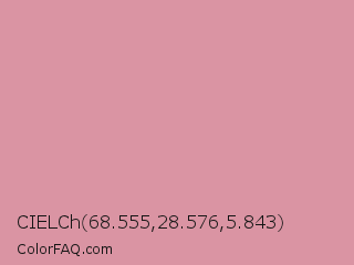 CIELCh 68.555,28.576,5.843 Color is a light red color and the nearest color is Parrot Pink #d998a0. Hex code #da94a3 and RGB value is rgb(218,148,163). In RGB color space, this color is composed of 85% red, 58% green, 64% blue, In CMYK color space, this color is composed of 0% cyan, 32% magenta, 25% yellow , 15% black , In HSL color space, this color has a hue angle of 347° , 49% saturation and 72% lightness.