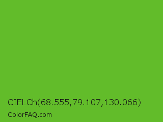 CIELCh 68.555,79.107,130.066 Color is a normal green color and the nearest color is Green RYB #66b032. Hex code #62bc2a and RGB value is rgb(98,188,42). In RGB color space, this color is composed of 38% red, 74% green, 16% blue, In CMYK color space, this color is composed of 48% cyan, 0% magenta, 78% yellow , 26% black , In HSL color space, this color has a hue angle of 97° , 63% saturation and 45% lightness.