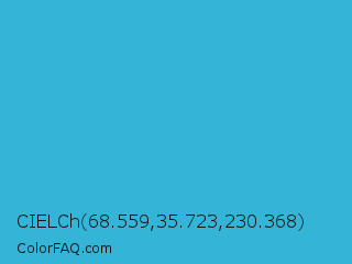 CIELCh 68.559,35.723,230.368 Color is a normal cyan color and the nearest color is Scooter #2ebfd4. Hex code #34b5d8 and RGB value is rgb(52,181,216). In RGB color space, this color is composed of 20% red, 71% green, 85% blue, In CMYK color space, this color is composed of 76% cyan, 16% magenta, 0% yellow , 15% black , In HSL color space, this color has a hue angle of 193° , 68% saturation and 53% lightness.