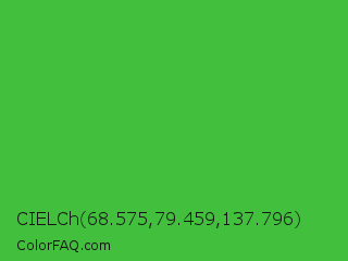 CIELCh 68.575,79.459,137.796 Color is a normal green color and the nearest color is Wageningen Green #34b233. Hex code #42bf3d and RGB value is rgb(66,191,61). In RGB color space, this color is composed of 26% red, 75% green, 24% blue, In CMYK color space, this color is composed of 65% cyan, 0% magenta, 68% yellow , 25% black , In HSL color space, this color has a hue angle of 118° , 52% saturation and 49% lightness.