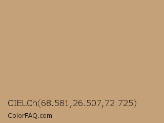 CIELCh 68.581,26.507,72.725 Color is a light orange color and the nearest color is Light French Beige #c8ad7f. Hex code #c5a17a and RGB value is rgb(197,161,122). In RGB color space, this color is composed of 77% red, 63% green, 48% blue, In CMYK color space, this color is composed of 0% cyan, 18% magenta, 38% yellow , 23% black , In HSL color space, this color has a hue angle of 31° , 39% saturation and 63% lightness.