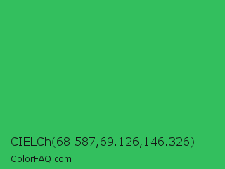CIELCh 68.587,69.126,146.326 Color is a normal green color and the nearest color is Medium Sea Green #3cb371. Hex code #33bf5e and RGB value is rgb(51,191,94). In RGB color space, this color is composed of 20% red, 75% green, 37% blue, In CMYK color space, this color is composed of 73% cyan, 0% magenta, 51% yellow , 25% black , In HSL color space, this color has a hue angle of 138° , 58% saturation and 47% lightness.