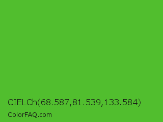CIELCh 68.587,81.539,133.584 Color is a normal green color and the nearest color is Kelly Green #4cbb17. Hex code #51be2e and RGB value is rgb(81,190,46). In RGB color space, this color is composed of 32% red, 75% green, 18% blue, In CMYK color space, this color is composed of 57% cyan, 0% magenta, 76% yellow , 25% black , In HSL color space, this color has a hue angle of 105° , 61% saturation and 46% lightness.