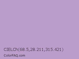 CIELCh 68.5,28.211,315.421 Color is a light purple color and the nearest color is London Hue #bea6c3. Hex code #bb9ccb and RGB value is rgb(187,156,203). In RGB color space, this color is composed of 73% red, 61% green, 80% blue, In CMYK color space, this color is composed of 8% cyan, 23% magenta, 0% yellow , 20% black , In HSL color space, this color has a hue angle of 280° , 31% saturation and 70% lightness.