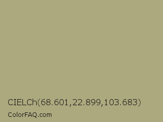 CIELCh 68.601,22.899,103.683 Color is a normal yellow color and the nearest color is Hillary #aca586. Hex code #ada97f and RGB value is rgb(173,169,127). In RGB color space, this color is composed of 68% red, 66% green, 50% blue, In CMYK color space, this color is composed of 0% cyan, 2% magenta, 27% yellow , 32% black , In HSL color space, this color has a hue angle of 55° , 22% saturation and 59% lightness.